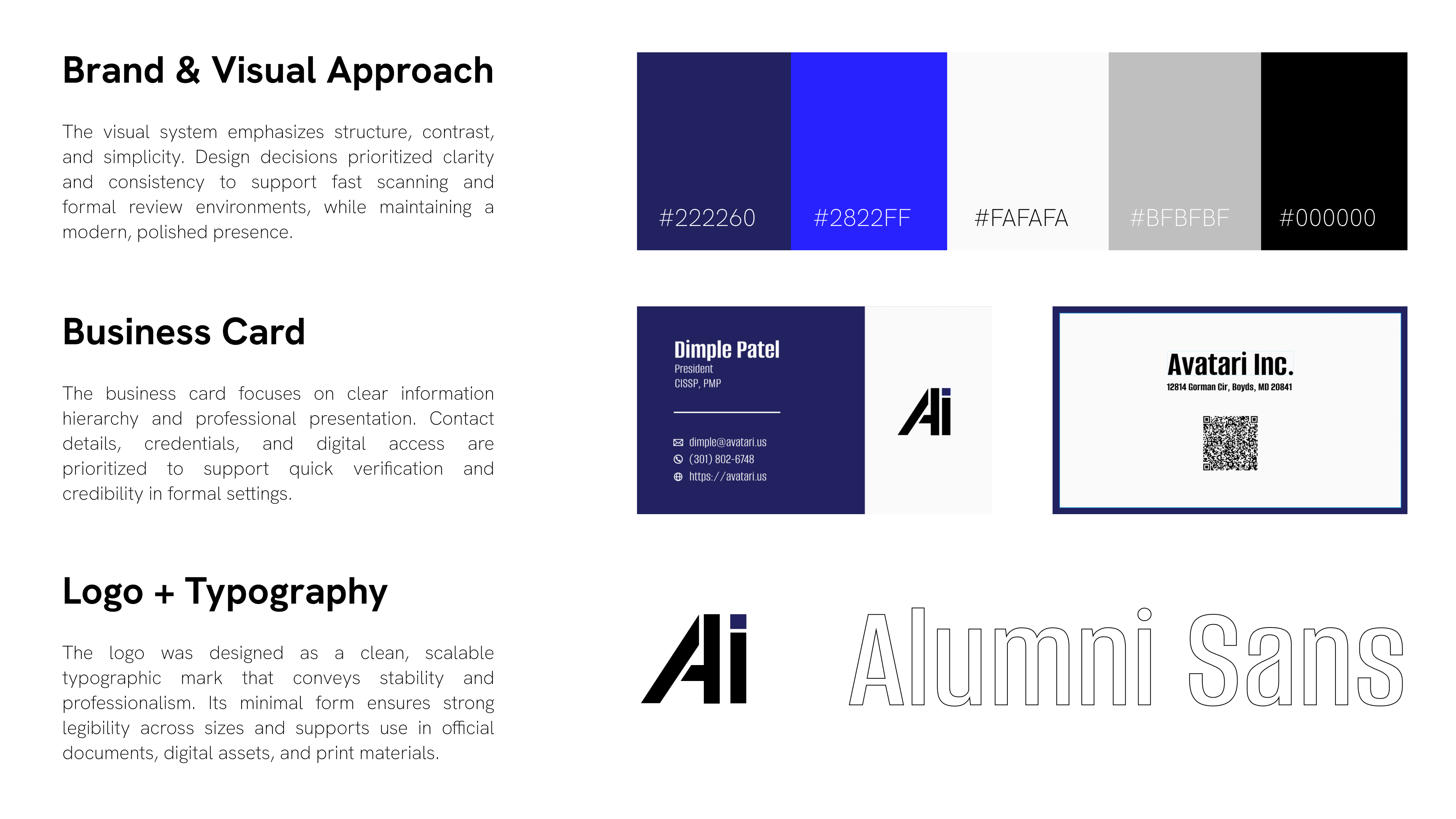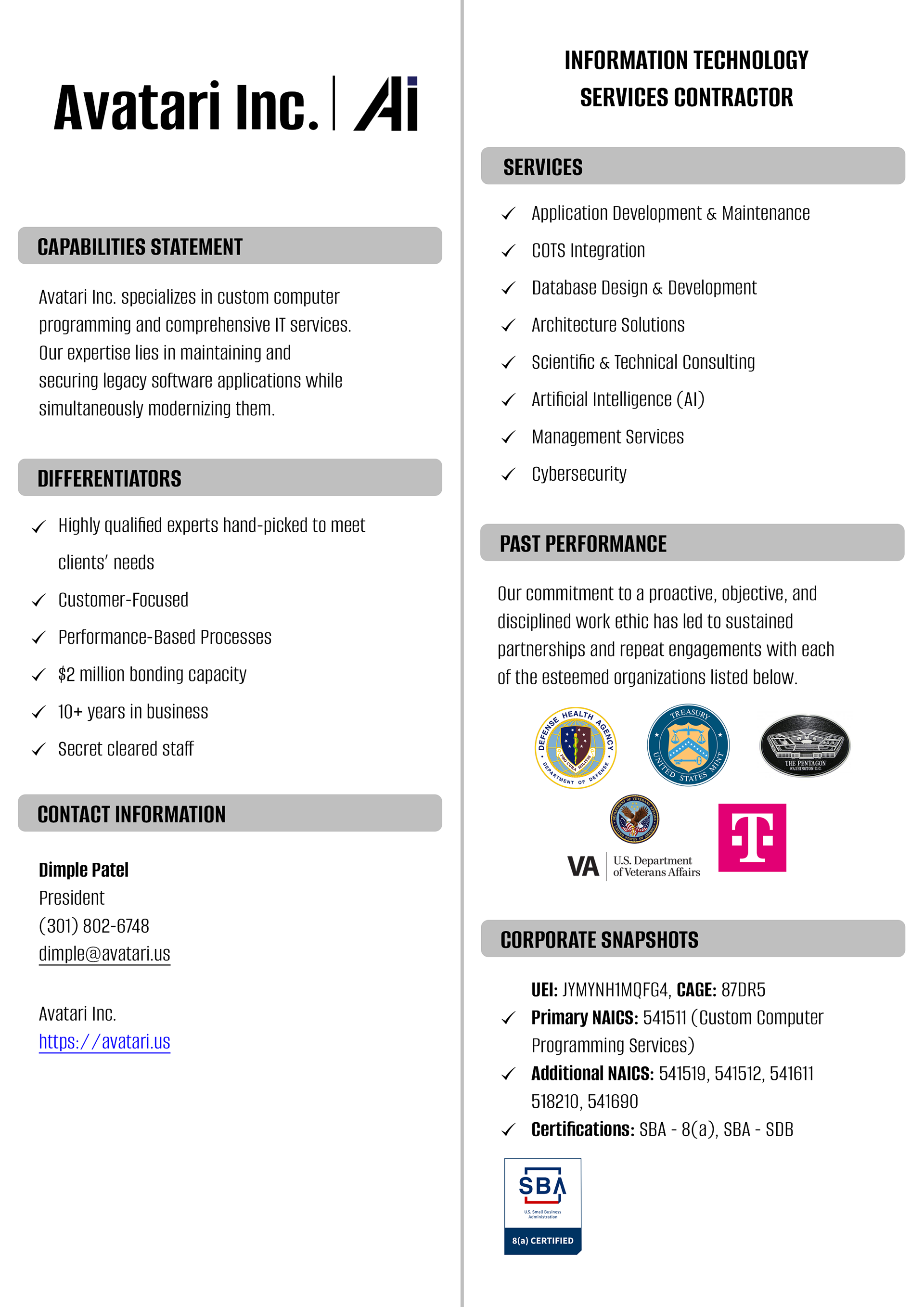Avatari Inc. is a technology and consulting firm supporting U.S. government agencies. The brand needed to communicate professionalism, reliability, and compliance across formal documentation and outreach materials.